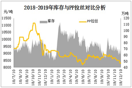 ????????2019年12月庫存顯示整體呈現震蕩下滑趨勢,整體庫存維持在60-70萬噸/年,但全球經濟偏弱運行及國內實體企業訂單力度不及預期,市場原料消耗力度受到制約。同時2019年PP新一輪擴能高峰期再次來臨,浙江石化及大連恒力等大型聚烯烴裝置落地試運行,市場供需壓力更加凸顯,加快現貨市場拉絲下挫壓力。