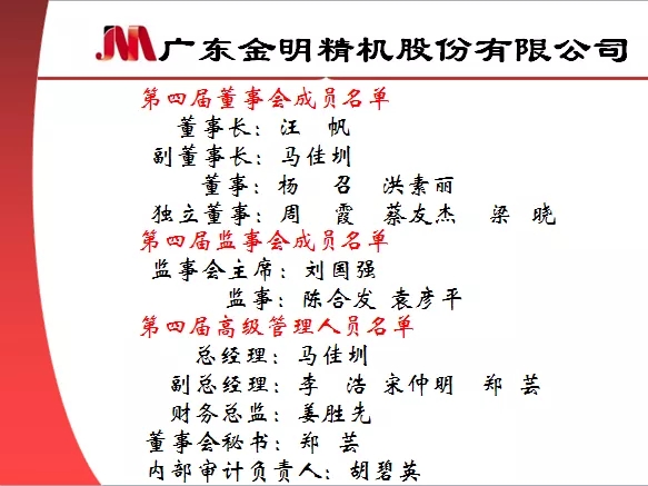 ????????本次換屆選舉中,汪帆先生、馬佳圳先生、楊召先生、洪素麗女士當選為公司非獨立董事,周霞女士、梁曉先生、蔡友杰先生當選為公司獨立董事,共同組成公司新一屆董事會;劉國強先生、陳合發先生當選為公司股東代表監事,與金明精機職工代表監事袁彥平先生共同組成公司新一屆監事會。