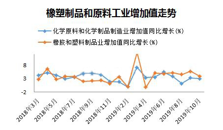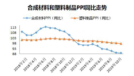 ????????10月份,化學原料和化學品制造業增加值同比增長3%,橡膠和塑料制品業增加值同比增長3.9%,顯然下游制品業增速還是快于上游原料,兩者增速差連續三個月收窄,源于10月份制品業下降速度快于原料。去年10月份PE、PP等塑料原料價格揭開下滑序幕,橡塑制品的增速明顯低于原料,總體看隨著原料端價格下跌,終端產品成本降低,從塑料制品增長角度看制品行業目前形勢略好于去年。