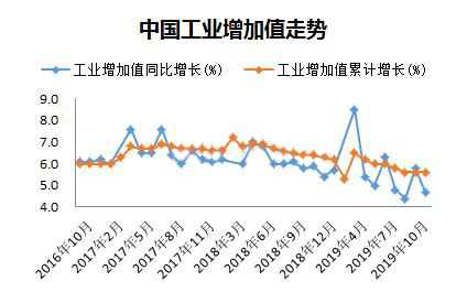 ????????國際統計局最新公布10月份數據顯示經濟持續下行壓力仍舊較大。2019年10月份,規模以上工業增加值同比實際增長4.7%(以下增加值增速均為扣除價格因素的實際增長率),比9月份回落1.1個百分點。從環比看,10月份,規模以上工業增加值比上月增長0.17%。1—10月份,規模以上工業增加值同比增長5.6%。