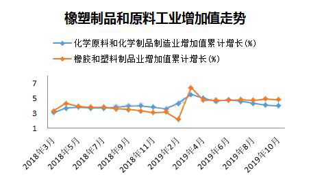 ????????1-10月份,化學原料和化學品制造業增加值同比增長4%,橡膠和塑料制品業增加值同比增長4.8%,年內兩者呈現持續下降態勢。兩者增速差與上月持平,較前幾個月有所擴大,表明原料端價格下降支撐了終端產出增速。塑料制品業工業增加值無論同比還是累計同比,數據均略高于去年同期,表明塑料下游行業好于塑料原料。