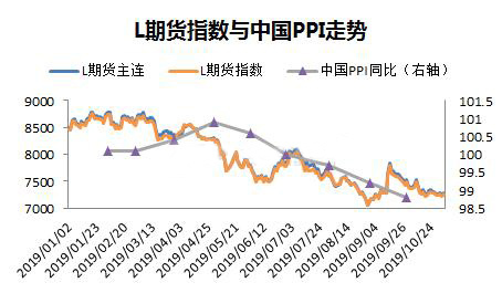 ????????2019年月初以來價格數據顯示,PE期貨和現貨相關度極高,幾乎同步漲跌,因此以下的分析,取期貨價格指數跟宏觀指標對比。