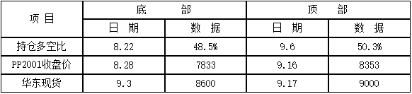 ????????第二、7月以來多空比曲線下行過程中,PP期現價格并不同步,多空比形成階段性底部和頂部相對領先,在50%臨界線之下,多單逐步增加,多空比逐步提升,此時配合基本面情況,有擇機介入短多的機會。多空比在8月22日達到階段性底部48.5%,之后開始一波反彈,多空比的底部領先期現價格一周左右時間,8月28日PP2001收盤7833元/噸,華東現貨在9月3日8600元/噸,相繼形成底部;9月6日,持倉多空比50.3%形成階段性頂部,且50%臨界線之上僅僅維持兩天就再次轉頭下行,此次多空比領先了期現價格10天左右。總之當多空比、期貨和現貨價格同向而行,“共振”之際,方可順勢而為。