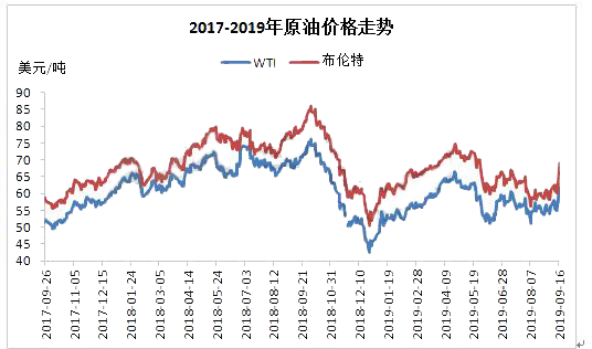 ????????9月14日,沙特關鍵原油設施遭受無人機攻擊,導致其關閉一半原油產量,影響全球約5%的日均產量。9月16日,原油受此提振大幅上漲,美布兩油均創下近十年內最大漲幅,紐約商品期貨交易所WTI 10月原油期貨合約收盤上漲8.05美元,至62.90美元/桶,漲幅14.68%,洲際交易所布倫特11月原油期貨合約收盤上漲8.80美元,至69.02美元/桶,漲幅14.61%。