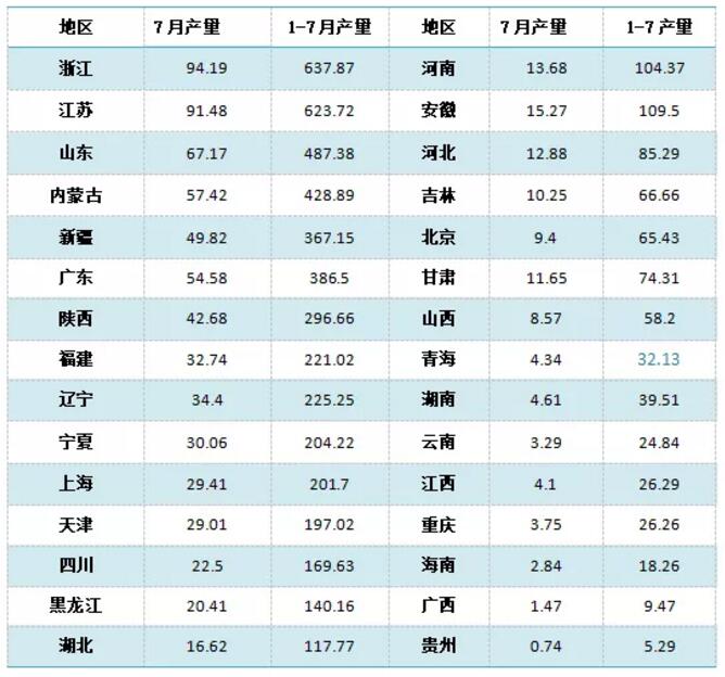 ????????1-7月初級(jí)形態(tài)塑料產(chǎn)量排名前五位(浙江、江蘇、山東、內(nèi)蒙古和廣東)的總產(chǎn)量達(dá)到2564.36萬(wàn)噸,占到全國(guó)總產(chǎn)量47%。(按7月規(guī)模企業(yè)統(tǒng)計(jì))