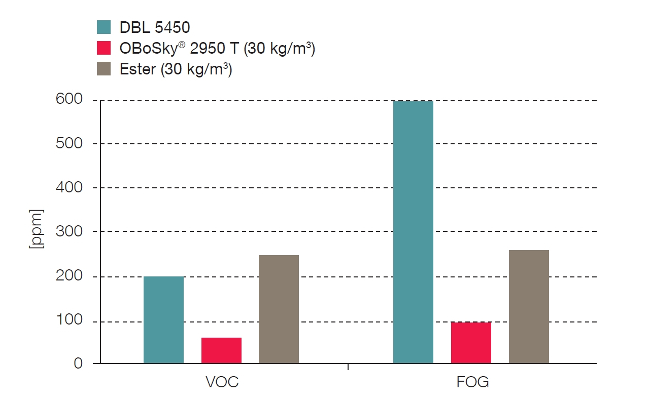 ????????據稱,頂篷級泡沫具有非常均勻的結構和細孔,提供易于在火焰和粘合過程中層壓的表面,同時粘附在表面輕質的裝飾紡織品上。據說該材料的醚基預聚物技術確保了非常好的耐水解性和長期的高機械性能。并且,與僅基于酯的泡沫相比,這種泡沫的VOC和FOG的水平顯著降低。根據VDA 278和VDA 270標準的VOC和FOG測試,OBoSky的測量結果明顯低于DBL 5450規定的限值,DBL 5450是戴姆勒基于聚氨酯的柔性泡沫的供應規定。