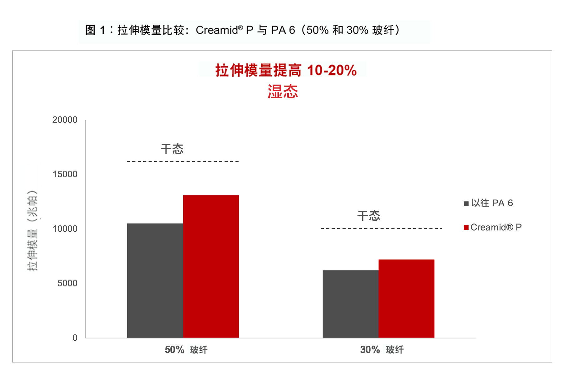 ????????在K 2019展會上,該公司將先行推出兩種Creamid P化合物,其玻纖含量分別為30%和50%。這些化合物經過24小時的濕度調節后,吸水量比典型聚酰胺6少大約80%,飽和吸水量比后者少大約30%。如圖1和圖2所示,濕態的Creamid? P2H7G6 和Creamid P3H2G10比典型PA6表現出更高的拉伸模量和拉伸斷裂強度,。