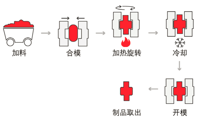 主要用于熱固性塑料制品的生產。成型經過加熱使其熔化,加壓沖模,再經過加熱交聯固化,脫模后既得制品。