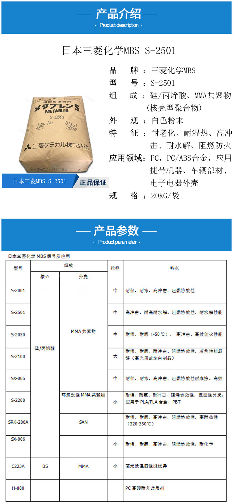 • 三菱麗陽增韌劑S2501 耐高溫耐水解 阻燃效應 高沖擊 日本S-2501 物性表, 三菱麗陽增韌劑S2501 耐高溫耐水解 阻燃效應 高沖擊 日本S-2501 產品參數,三菱麗陽增韌劑S2501 耐高溫耐水解 阻燃效應 高沖擊 日本S-2501 性能表,三菱麗陽增韌劑S2501 耐高溫耐水解 阻燃效應 高沖擊 日本S-2501 出廠報告, MSDS,, 物質安全資料表, UL黃卡,{ SGS報告, RoHS, 食品級認證, NSF飲用水標準, 產品資料, 產品性能, 出廠報告, 原廠原包, 代理商, 熱變形溫度, 熔指數, 流動系數, 抗沖擊性能、沖擊強度, 低溫韌性、低溫抗沖擊性能, 熔體流動系數、熔體流動速率, 加工工藝、加工參數、加工溫度, 歐盟RoHS 德國FDA 美國FDA 日本FDA