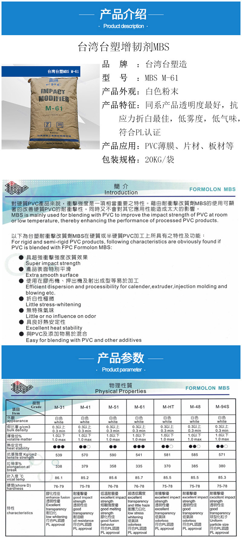 - 臺(tái)塑MBS M61高透明性 MBS61 抗折白 PVC簿膜片材板材增韌劑M-61 物性表, 臺(tái)塑MBS M61高透明性 MBS61 抗折白 PVC簿膜片材板材增韌劑M-61 產(chǎn)品參數(shù),臺(tái)塑MBS M61高透明性 MBS61 抗折白 PVC簿膜片材板材增韌劑M-61 性能表,臺(tái)塑MBS M61高透明性 MBS61 抗折白 PVC簿膜片材板材增韌劑M-61 出廠報(bào)告, MSDS,, 物質(zhì)安全資料表, UL黃卡,{ SGS報(bào)告, RoHS, 食品級(jí)認(rèn)證, NSF飲用水標(biāo)準(zhǔn), 產(chǎn)品資料, 產(chǎn)品性能, 出廠報(bào)告, 原廠原包, 代理商, 熱變形溫度, 熔指數(shù), 流動(dòng)系數(shù), 抗沖擊性能、沖擊強(qiáng)度, 低溫韌性、低溫抗沖擊性能, 熔體流動(dòng)系數(shù)、熔體流動(dòng)速率, 加工工藝、加工參數(shù)、加工溫度, 歐盟RoHS 德國(guó)FDA 美國(guó)FDA 日本FDA