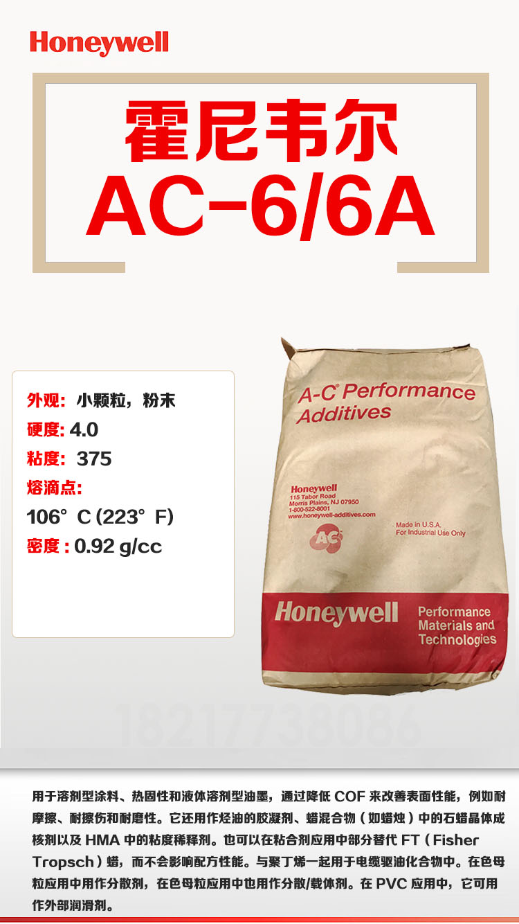 • 美國霍尼韋爾AC-6聚乙烯蠟工藝蠟燭專用加工助劑 物性表, 美國霍尼韋爾AC-6聚乙烯蠟工藝蠟燭專用加工助劑 產(chǎn)品參數(shù),美國霍尼韋爾AC-6聚乙烯蠟工藝蠟燭專用加工助劑 性能表,美國霍尼韋爾AC-6聚乙烯蠟工藝蠟燭專用加工助劑 出廠報告, MSDS,, 物質(zhì)安全資料表, UL黃卡,{ SGS報告, RoHS, 食品級認(rèn)證, NSF飲用水標(biāo)準(zhǔn), 產(chǎn)品資料, 產(chǎn)品性能, 出廠報告, 原廠原包, 代理商, 熱變形溫度, 熔指數(shù), 流動系數(shù), 抗沖擊性能、沖擊強度, 低溫韌性、低溫抗沖擊性能, 熔體流動系數(shù)、熔體流動速率, 加工工藝、加工參數(shù)、加工溫度, 歐盟RoHS 德國FDA 美國FDA 日本FDA
