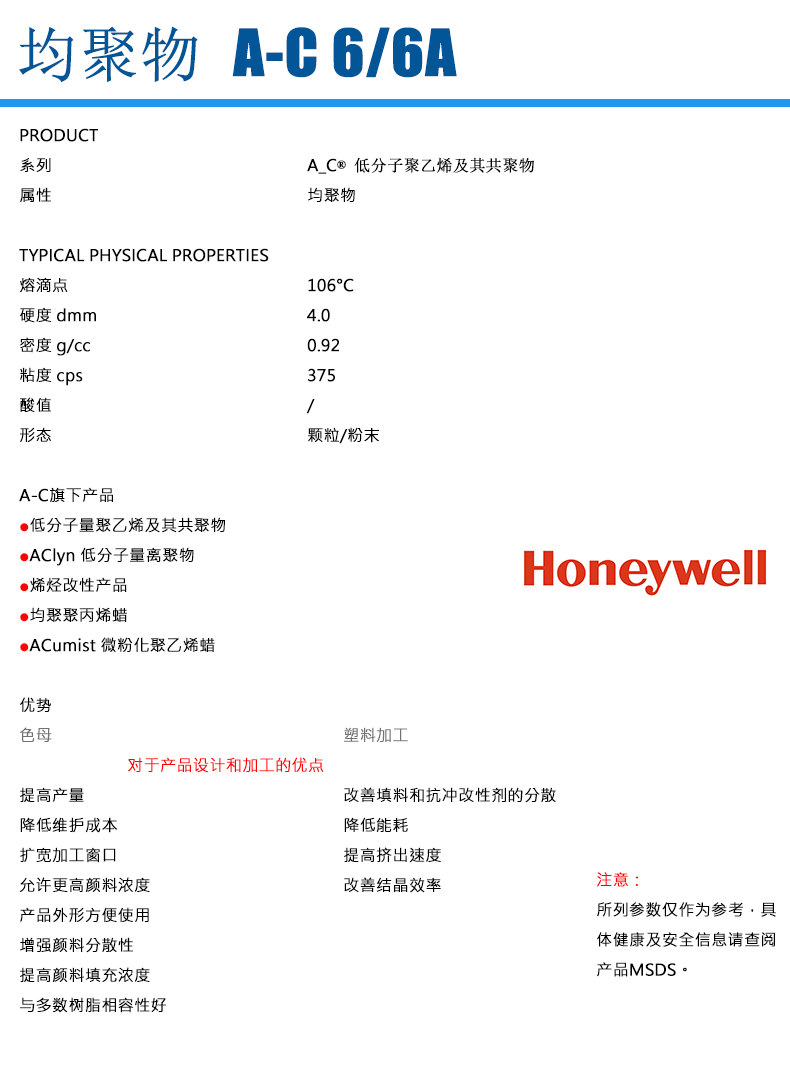 - 美國霍尼韋爾 HONEYWELL AC-6A 低分子聚乙烯蠟 物性表, 美國霍尼韋爾 HONEYWELL AC-6A 低分子聚乙烯蠟 產品參數,美國霍尼韋爾 HONEYWELL AC-6A 低分子聚乙烯蠟 性能表,美國霍尼韋爾 HONEYWELL AC-6A 低分子聚乙烯蠟 出廠報告, MSDS,, 物質安全資料表, UL黃卡,{ SGS報告, RoHS, 食品級認證, NSF飲用水標準, 產品資料, 產品性能, 出廠報告, 原廠原包, 代理商, 熱變形溫度, 熔指數, 流動系數, 抗沖擊性能、沖擊強度, 低溫韌性、低溫抗沖擊性能, 熔體流動系數、熔體流動速率, 加工工藝、加工參數、加工溫度, 歐盟RoHS 德國FDA 美國FDA 日本FDA