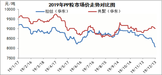 目前國內石化庫存一直在降庫為主,多連續下調出廠降價銷售。而下游工廠采購多維持剛需,市場供需矛盾的突出,使得不少貿易商轉向觀望。2019年逐漸步入尾聲,又有兩家廠家近期不斷傳出試車的好消息:浙江石化PP裝置12月8日造粒裝置試車成功,原料為外采丙烯,該PP裝置產能90萬噸/年(兩條線各45萬噸/年);其次是大連恒力二期試運行計劃推遲在12月底試車STPP裝置,春節前后試運行JPP裝置和乙烯裂解裝置。二期40萬噸/年(STPP和JPP線各20萬噸)。終端剛性需求縮水,高端貨源跟進謹慎,行情下行明顯。