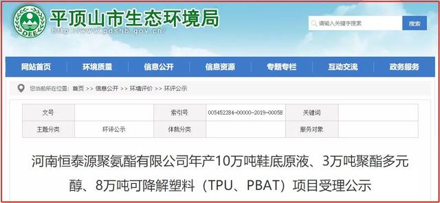 2019年12月13日,平頂山市生態(tài)環(huán)境局發(fā)布河南恒泰源聚氨酯有限公司年產(chǎn)10萬噸鞋底原液、3萬噸聚酯多元醇、8萬噸可降解塑料(TPU、PBAT)項(xiàng)目受理公示。