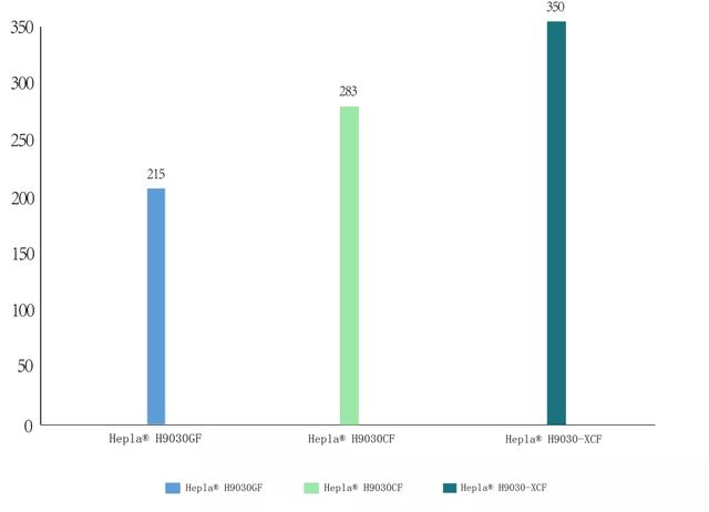 下圖為Hepla? H9030-XCF與Hepla? H9030CF、Hepla? H9030GF在200℃條件下的拉伸強(qiáng)度對照圖。