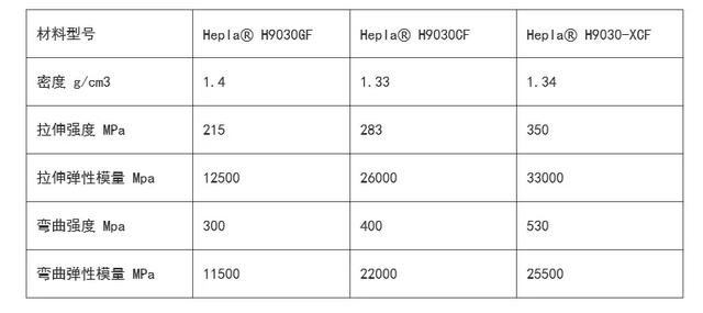 該產(chǎn)品具有優(yōu)異的機(jī)械強(qiáng)度與抗沖擊能力,尺寸穩(wěn)定性高、翹曲低,材料性能較進(jìn)口產(chǎn)品提升30%。以高溫尼龍為基材的Hepla? H9000-XCF系列碳纖維復(fù)合材料,彎曲剛度超過52GPa,彎曲強(qiáng)度高達(dá)520MPa,拉伸強(qiáng)度達(dá)到360MPa;以PA66為基材的Hepla? H7200-XCF系列拉伸強(qiáng)度達(dá)到315MPa。 采用新產(chǎn)品生產(chǎn)的零部件比鋼制零部件輕75%,比鋁合金部件輕40%,可替代大部分金屬,從而為汽車輕量化及其它行業(yè)“以塑代鋼”提供更好的解決方案。