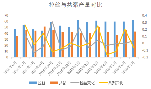 ????????拉絲價格走高除受期貨拉漲以外,粉料價格高位仍在支撐粒料價格高位不下的原因,裝置排產來看,部分停車裝置再現利好,新投產裝置量產偏少,拉絲體量較大,且多為快消品,剛需存在。