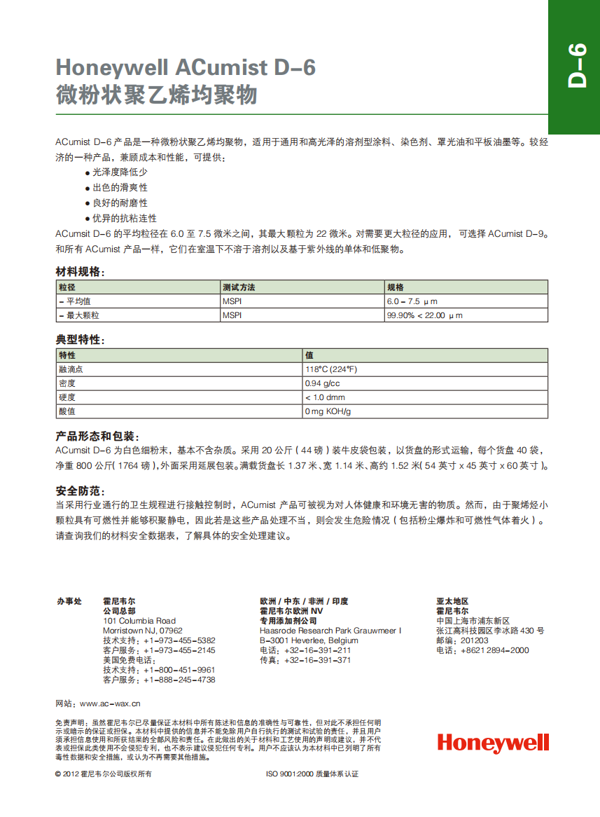 • 霍尼韋爾微粉蠟D6聚乙烯均聚物Honeywell ACumist D-6 物性表, 霍尼韋爾微粉蠟D6聚乙烯均聚物Honeywell ACumist D-6 產品參數(shù),霍尼韋爾微粉蠟D6聚乙烯均聚物Honeywell ACumist D-6 性能表,霍尼韋爾微粉蠟D6聚乙烯均聚物Honeywell ACumist D-6 出廠報告, MSDS,, 物質安全資料表, UL黃卡,{ SGS報告, RoHS, 食品級認證, NSF飲用水標準, 產品資料, 產品性能, 出廠報告, 原廠原包, 代理商, 熱變形溫度, 熔指數(shù), 流動系數(shù), 抗沖擊性能、沖擊強度, 低溫韌性、低溫抗沖擊性能, 熔體流動系數(shù)、熔體流動速率, 加工工藝、加工參數(shù)、加工溫度, 歐盟RoHS 德國FDA 美國FDA 日本FDA