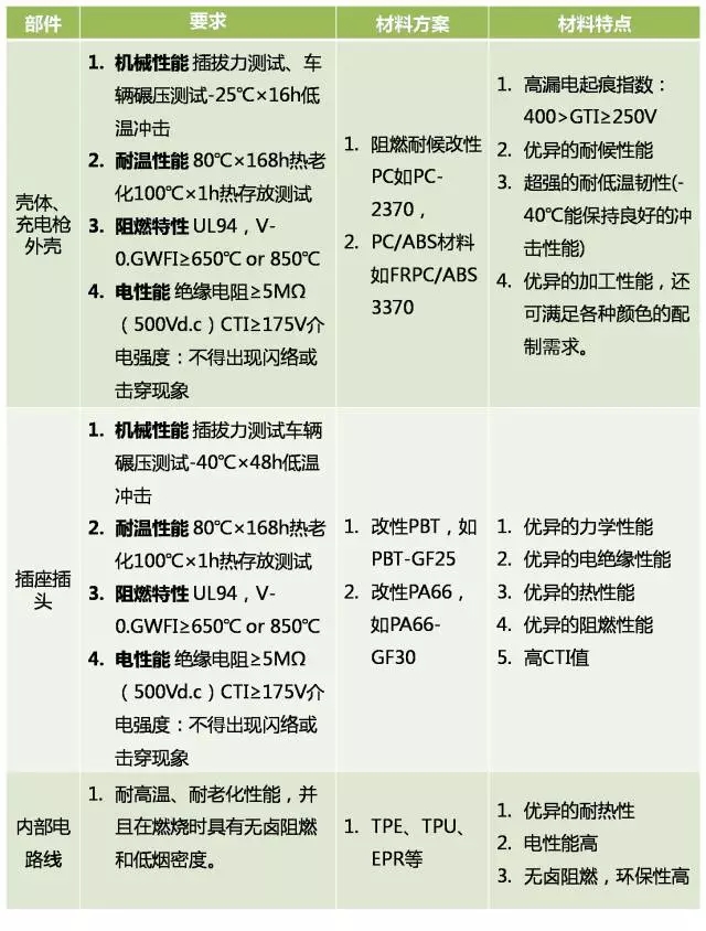 ????????充電設施的標準目前也尚不完全一致。由于不同電動汽車的電壓平臺不同,再加上接口、通訊協議等技術因素的不同,這直接導致了樁與樁之間不能互聯互通,而且車樁不匹配的問題非常突出。充電設施包括充電樁、高壓線、高壓接插件和充電槍等高壓部件。其重要性與車內的動力電池一樣,都需要考慮充電的阻燃性、安全性等方面。根據目前國內發布的充電設施的標準和要求,我們對充電樁和充電槍外殼、插座插頭以及內部的高壓線束的阻燃材料進行了整理,并列舉了目前充電設施的產品,對相應的材料性能特點進行分析。